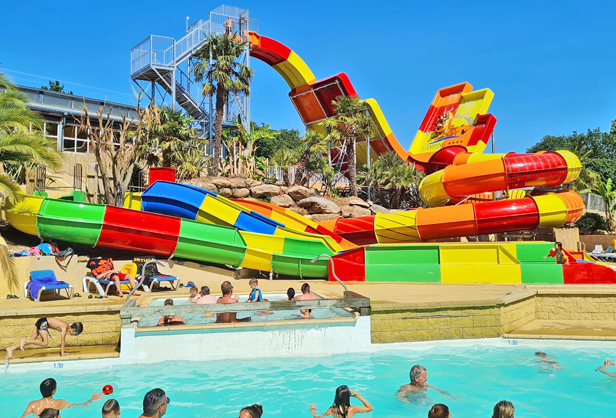 - Amplia zona acuática cubierta en un entorno colorido y floral con una gran piscina, piscina infantil y toboganes (1 Spacebowl, 1 Kamikaze y 4 Pentagliss y 2 toboganes) para entretener a grandes y pequeños.